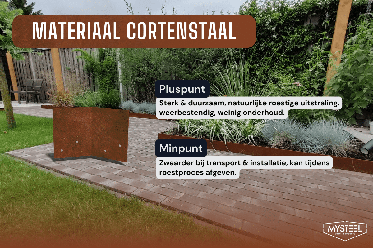 Oțelul și oțelul corten sunt puternice și durează mult, dar aspectul ruginit și întreținerea diferă. Plasticul este ușor și flexibil, în timp ce lemnul are un aspect natural, dar este sensibil la putrezire. Pietrele sunt durabile, dar oțelul corten are un aspect modern și mai multă flexibilitate.