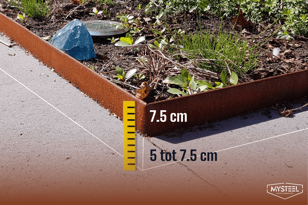 În general, recomandăm să instalezi marginea de bordură la o adâncime de aproximativ o treime până la jumătate din înălțimea marginii în pământ. Astfel, marginea rămâne fermă și nu se afundă. Dacă marginea ta este, de exemplu, de 15 centimetri înălțime, este cel mai bine să o instalezi la aproximativ 5 până la 7,5 centimetri adâncime în pământ.