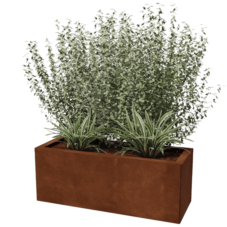 Panourile jardinierei noastre modulare sunt fabricate din tablă de oțel de înaltă calitate Corten-A. Acest tip de metal are ca proprietate unică formarea unei pieli de oxid foarte dense (strat de rugină) care face imposibilă rugina. Datorită pielii dense de oxid, materialul din interior este protejat de oxigen, astfel oxidarea este încetinită semnificativ, în timp ce coroziunea continuă. Jardinierele din oțel corten sunt livrate neoxidate, în culoarea metalică gri. Procesul de ruginire începe după câteva săptămâni până la 2 luni, fără a fi necesară o tratament. În timpul procesului de ruginire, jardinierele pot lăsa urme. Oțelul corten este o aliaje metalice care conține fier, la care s-au adăugat cupru, fosfor, siliciu, nichel și crom.