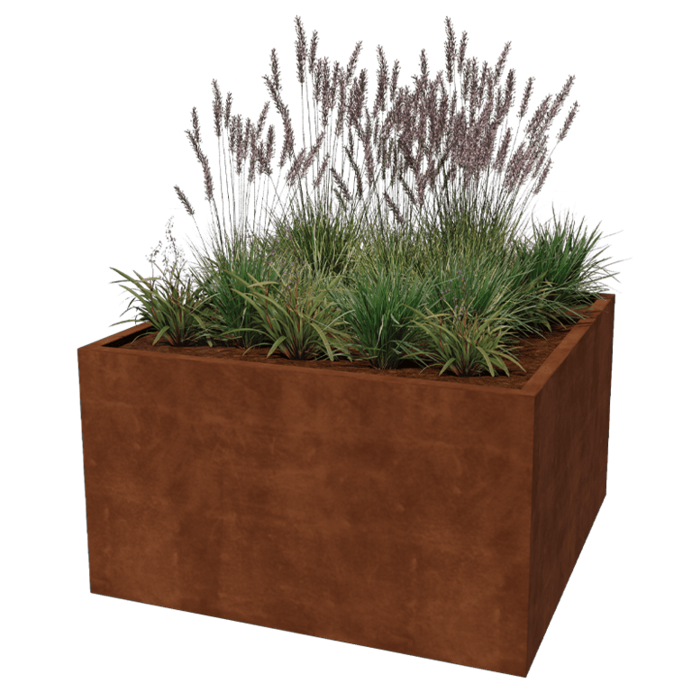 Aceste ghivece sunt fabricate din tablă de oțel de înaltă calitate Corten-A. Acest tip de metal are ca proprietate unică formarea unei pieli de oxid foarte dense (strat de rugină) . Prin urmare, rugina nu poate pătrunde. Datorită pielii dense de oxid, materialul din interior este protejat de oxigen, astfel oxidarea este foarte încetinită în timp ce coroziunea continuă. Ghiveciul din oțel corten este livrat neoxidat, în culoarea metalică gri. Începerea procesului de ruginire începe în primele 2 luni, nu este necesară nicio tratament pentru aceasta. În timpul procesului de ruginire, ghiveciul poate lăsa urme. Oțelul corten este o aliaj metalic care constă din fier, la care s-au adăugat cupru, fosfor, siliciu, nichel și crom.