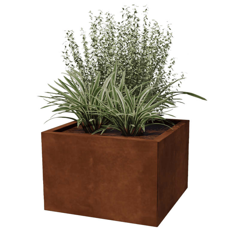 Panourile jardinierei noastre modulare sunt fabricate din tablă de oțel de înaltă calitate Corten-A. Acest tip de metal are ca proprietate unică formarea unei pieli de oxid foarte dense (strat de rugină) care face imposibilă rugina. Datorită pielii dense de oxid, materialul din interior este protejat de oxigen, astfel oxidarea este încetinită semnificativ, în timp ce coroziunea continuă. Jardinierele din oțel corten sunt livrate neoxidate, în culoarea metalică gri. Procesul de ruginire începe după câteva săptămâni până la 2 luni, fără a necesita un tratament special. În timpul procesului de ruginire, jardinierele pot lăsa urme. Oțelul corten este o aliaj metalic care conține fier, la care s-au adăugat cupru, fosfor, siliciu, nichel și crom.