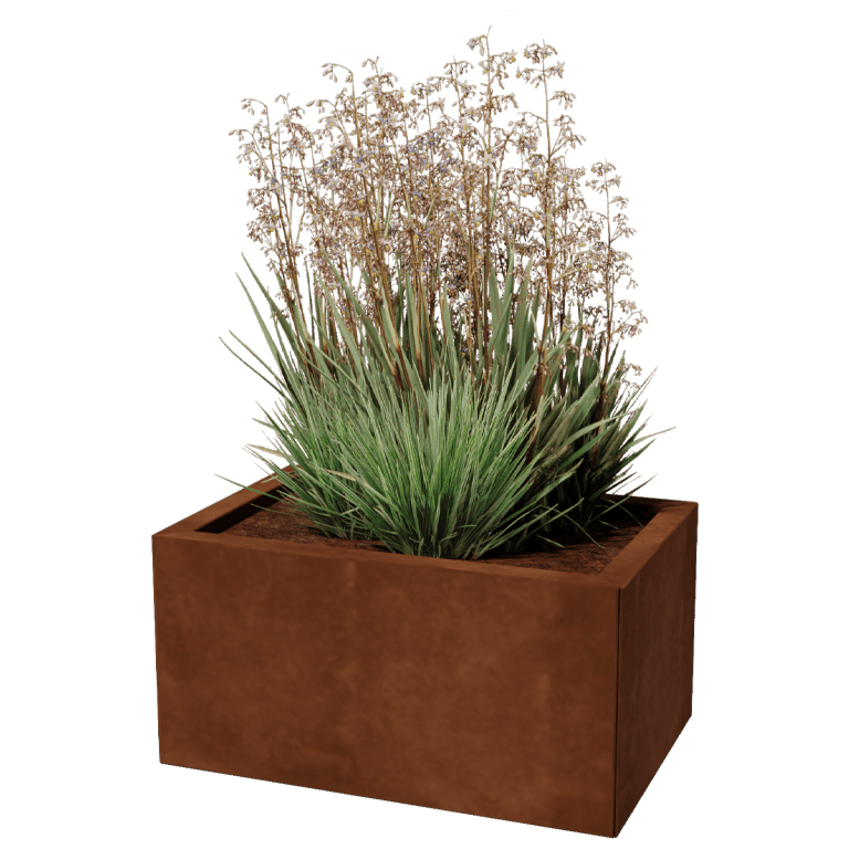 Panourile jardinierei noastre modulare sunt fabricate din tablă de oțel de înaltă calitate Corten-A. Această specie de metal are ca proprietate unică formarea unei pieli de oxid foarte dense (strat de rugină) . Prin urmare, rugina nu poate pătrunde. Datorită pielii dense de oxid, materialul din interior este protejat de oxigen, astfel oxidarea este încetinită semnificativ, în timp ce coroziunea continuă. Jardinierele din oțel corten sunt livrate neoxidate, în culoarea metalică gri. Procesul de ruginire începe după câteva săptămâni până la 2 luni, fără a necesita un tratament special. În timpul procesului de ruginire, jardinierele pot lăsa urme. Oțelul corten este o aliaj metalic care conține fier, la care s-au adăugat cupru, fosfor, siliciu, nichel și crom.
