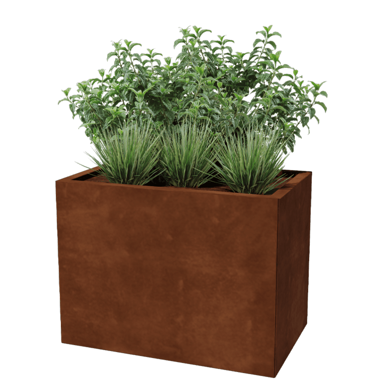 Marginea superioară este dublu întoarsă. Acest lucru conferă jardinierei un aspect atemporal și robust. Culoarea ruginită oferă un aspect cald și face ca aceste jardiniere să fie aplicabile în grădini moderne și clasice. Grosimea materialului depinde de înălțime. Jardinierele cu o înălțime de până la 60 cm au o grosime de 1,5 mm. De la o înălțime de 80 cm, materialul are o grosime de 2 mm. S-a testat extensiv că aceste grosimi sunt suficiente pentru jardiniere.