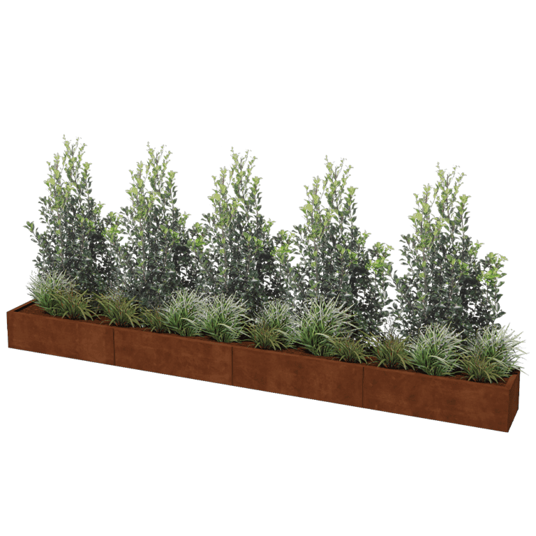 Panourile jardinierei noastre modulare sunt fabricate din tablă de oțel de înaltă calitate Corten-A. Această specie de metal are ca proprietate unică formarea unei pieli de oxid foarte dense (strat de rugină) care face imposibilă rugina. Datorită pielii dense de oxid, materialul din interior este protejat de oxigen, astfel oxidarea este încetinită semnificativ, în timp ce coroziunea continuă. Jardinierele din oțel corten sunt livrate neoxidate, în culoarea metalică gri. Procesul de ruginire începe după câteva săptămâni până la 2 luni, fără a necesita un tratament special. În timpul procesului de ruginire, jardinierele pot lăsa urme. Oțelul corten este o aliaj de metal care conține fier, la care s-au adăugat cupru, fosfor, siliciu, nichel și crom.