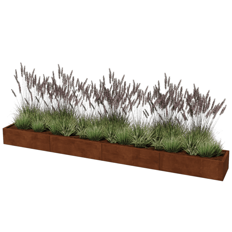 Panourile jardinierei noastre modulare sunt fabricate din tablă de oțel de înaltă calitate Corten-A. Acest tip de metal are ca proprietate unică formarea unei pieli de oxid foarte dense (strat de rugină) . Prin urmare, rugina nu poate pătrunde. Datorită pielii dense de oxid, materialul de dedesubt este protejat de oxigen, astfel încât oxidarea este încetinită semnificativ, în timp ce coroziunea continuă. Jardinierele din oțel corten sunt livrate neoxidate, în culoarea metalică gri. Procesul de ruginire începe după câteva săptămâni până la 2 luni, fără a fi necesară o tratament. În timpul procesului de ruginire, jardinierele pot lăsa urme. Oțelul corten este o aliaj metalic care conține fier, la care s-au adăugat cupru, fosfor, siliciu, nichel și crom.