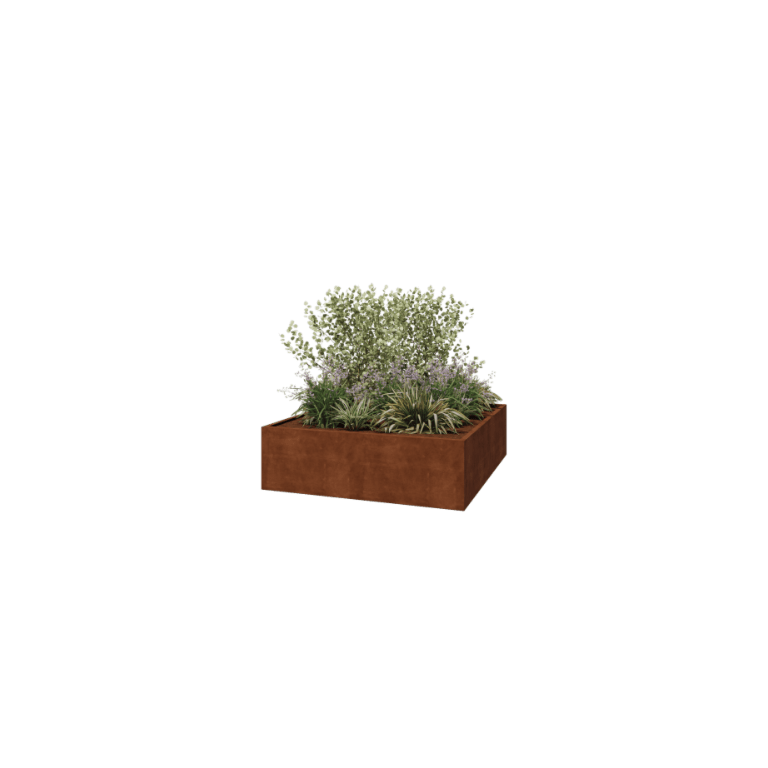 Aceste ghivece sunt fabricate din oțel de înaltă calitate Corten-A. Acest tip de metal are ca proprietate unică formarea unei pieli de oxid foarte dense (strat de rugină) . Prin urmare, rugina nu poate pătrunde. Datorită pielii dense de oxid, materialul din interior este protejat de oxigen, astfel oxidarea este foarte încetinită în timp ce coroziunea continuă. Ghiveciul din oțel corten este livrat neoxidat, în culoarea metalică gri. Începerea procesului de ruginire începe în primele 2 luni, nu este necesară nicio tratament. În timpul procesului de ruginire, ghiveciul poate lăsa urme. Oțelul corten este o aliaje metalice care constă din fier, la care s-au adăugat cupru, fosfor, siliciu, nichel și crom