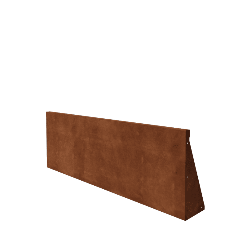Pereții de sprijin sunt fabricați din tablă de oțel Corten-A de înaltă calitate. Acest tip de metal are ca proprietate unică formarea unei pieli de oxid foarte dense (strat de rugină). Prin urmare, rugina nu poate pătrunde. Datorită pielii dense de oxid, materialul din adâncime este protejat de oxigen, ceea ce încetinește semnificativ oxidarea, în timp ce coroziunea continuă. Pereții de sprijin sunt livrați fără rugină, în culoarea metalică gri. Începerea procesului de rugină începe în primele 2 luni, pentru care nu este necesară nicio tratament. În timpul procesului de rugină, pereții de sprijin pot lăsa urme. Oțelul Corten este o aliaj metalic care constă din fier, la care s-au adăugat cupru, fosfor, siliciu, nichel și crom.